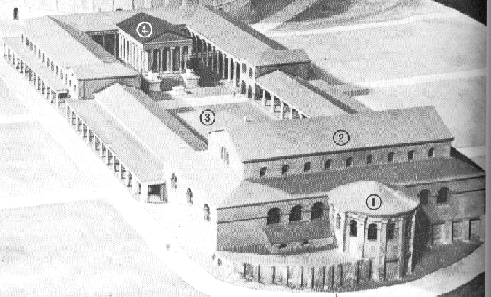 2 Basilika 3 Platz mit Säulengang; hinter dem Säulengang Läden 4 Jupitertempel Im Vordergrund die Curia (1).
