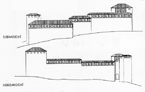 Das Kastell Piniana (Bürgle bei Grundremmingen) ist ein Beispiel für die Unregelmäßigkeit und Geländeanpassung der damaligen Anlagen. Oben an den Mauern die Schießscharten. Der Name "Bürgle" geht auf den römischen Begriff "Burgus" zurück.