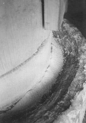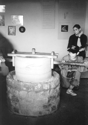 Am großen Mühlstein im Backhaus mußte sehr lange gelaufen werden, um die Ration für das zu backende Brot zu erhalten. Von Menschenhand getrieben, war es sehr anstrengend.
