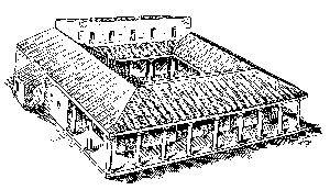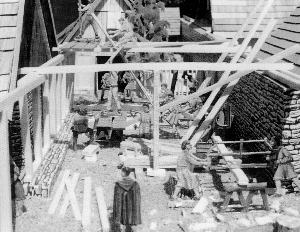 Zuerst stellte man Pfosten auf. Danach legte man einen Balken auf die Pfosten. Danach kam wieder eine Schwelle. Dazwischen wurden die Balken eingesetzt. Nun kamen noch die Bodenbretter für den Speicher im Dach.
