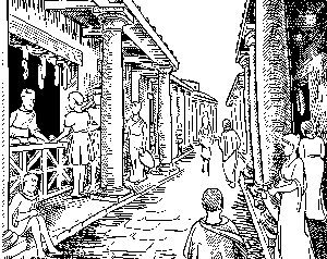 Die Häuser standen mit ihrer straßenseitigen Mauer auf Säulen. Die untere Hauswand war nach hinten versetzt. Es entstand so zwischen den Häusern eine Passage, durch die man die gesamte Stadt durchqueren konnte. Zwischen den Säulen der Häuser hatten die Händler ihre Stände aufgebaut.