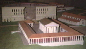 Im Vordergrund das Merkurheiligtum. Vom Theater aus konnte man bei herausgenommener Holzwand - wie in der Abbildung gezeigt - zusehen, wie vor dem Tempel geopfert wurde. Vom Tempel konnten Prozessionen zum Theater durchgeführt werden. Im Theater selbst erkennt man die keilförmige Anordnung der Sitzreihen und einen Treppenaufgang. Die Bühnenwand ist bis zum oberen abschließenden Umgang hochgezogen.