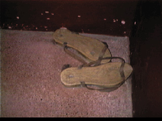Man sieht unten eine Sitzbank und an der Wand ein Ablagebrett für die Kleidung für mehrere Personen. Im Bild unten: Badeschuhe aus Holz, damit man sich im Heißbad nicht am aufgeheizten Fussboden die Fuesse verbrennt.