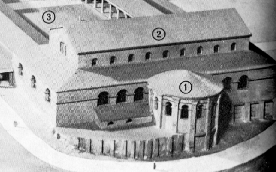 Die drei Schiffe - 2 Seitenschiffe und erhöhtes Hauptschiff - sind von außen gut zu sehen. Davor die Curia auf kreisförmigem Grundriß. Die Sessel der Ratsherren (Decurionen) waren im Kreis zur Wand hin ansteigend angeordnet. Das Untergeschoß war mit Schutt des Vorgängerbaus gefüllt. Hinter der Basilika das Hauptforum.