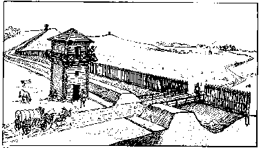 Graben und einem Wall, dahinter standen in regelmäßigen Abständen