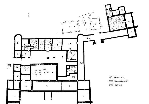 Im Eckrisalit sind Ausstellungsräume untergebracht, in denen in Ton und Bild die Geschichte der Villa Rustica erzählt wird und ein Modell des möglichen Aussehens und viele Fundgegenstände ausgestellt sind. Ebenso werden Szenen des damaligen Lebens dargestellt, Schlaf- und Eßräume, Sitzmöbel und Betten. Beeindruckend ist die Jupitersäule im nordwestlichen Teil der Außenanlage.