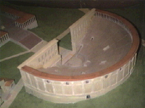 Im Vordergrund das Merkurheiligtum. Vom Theater aus konnte man bei herausgenommener Holzwand - wie in der Abbildung gezeigt - zusehen, wie vor dem Tempel geopfert wurde. Vom Tempel konnten Prozessionen zum Theater durchgeführt werden. Im Theater selbst erkennt man die keilförmige Anordnung der Sitzreihen und einen Treppenaufgang. Die Bühnenwand ist bis zum oberen abschließenden Umgang hochgezogen.
